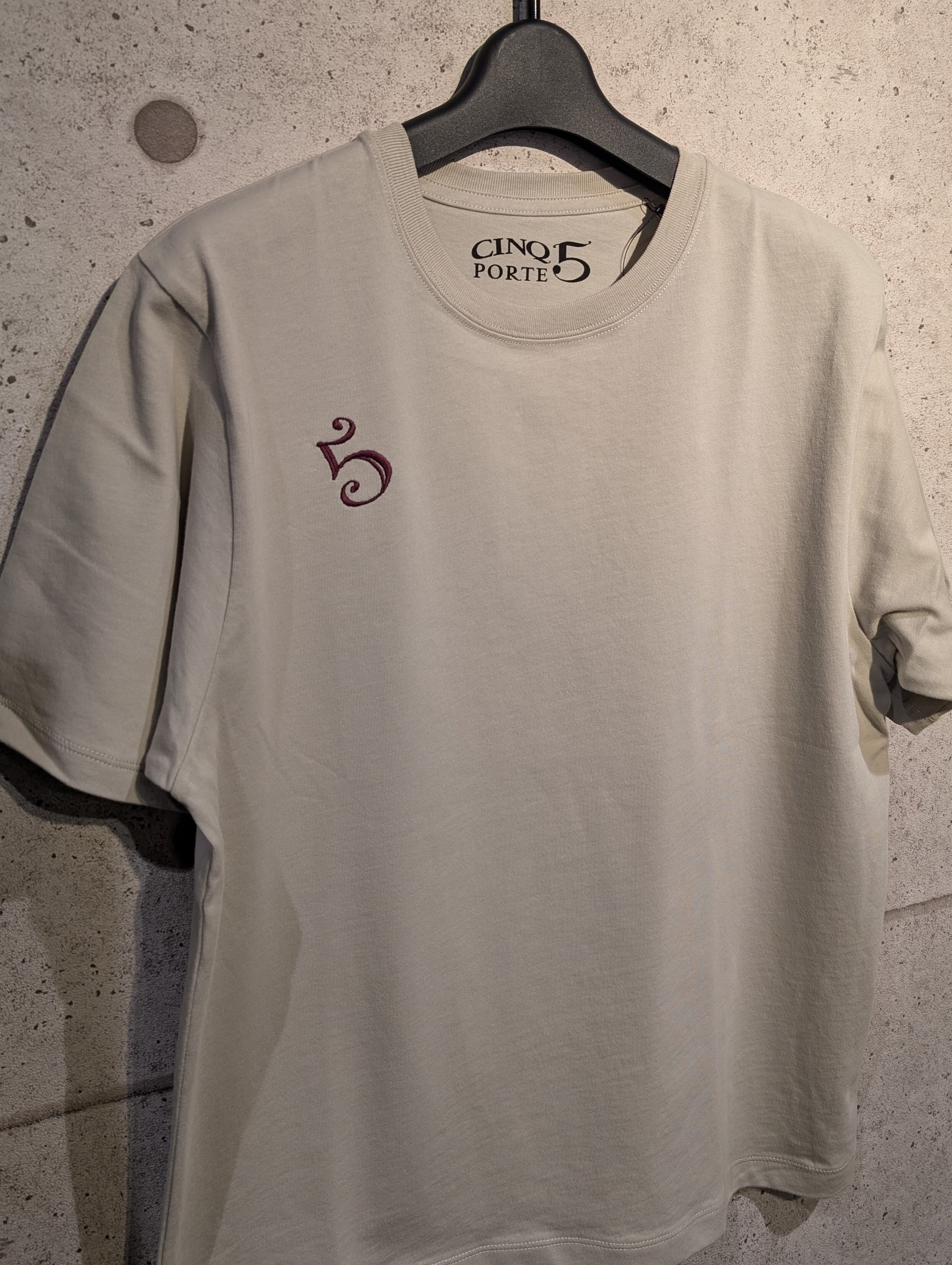 サンクポルトオリジナルのフォントで刺繍された「5」の数字が目を引くTシャツです。細番手の綿100%の糸を2本取りで編み立てた生地を使用しており、夏用のTシャツより少し肉厚ですが柔らかな着心地が魅力です。身幅や袖丈など、細部までこだわったオリジナルのシルエットで、サイズMは身幅108cmとゆとりがあるため、男性にもおすすめです。シンプルながらも個性的なデザインで、様々なスタイルに合わせやすい一枚です。