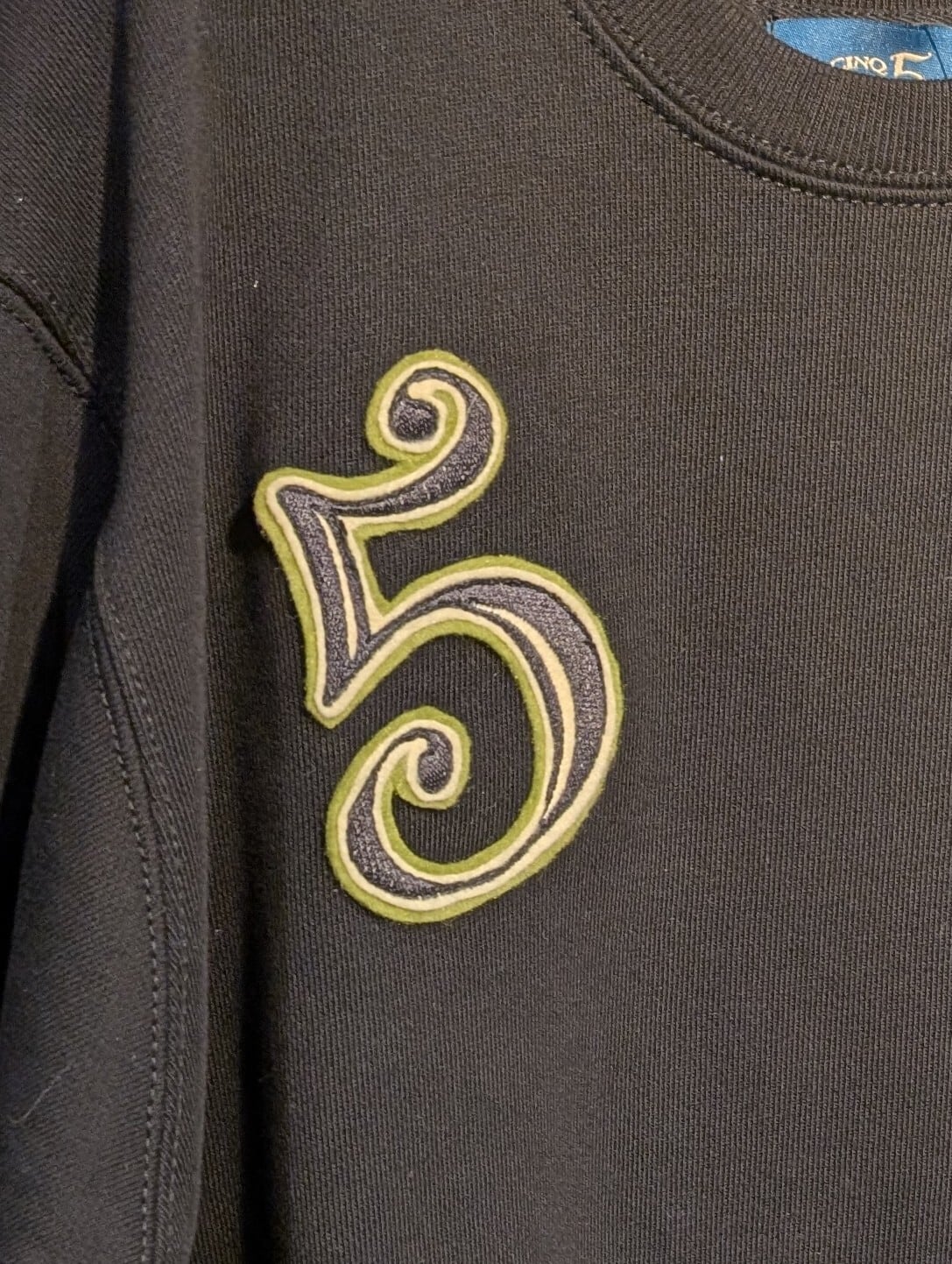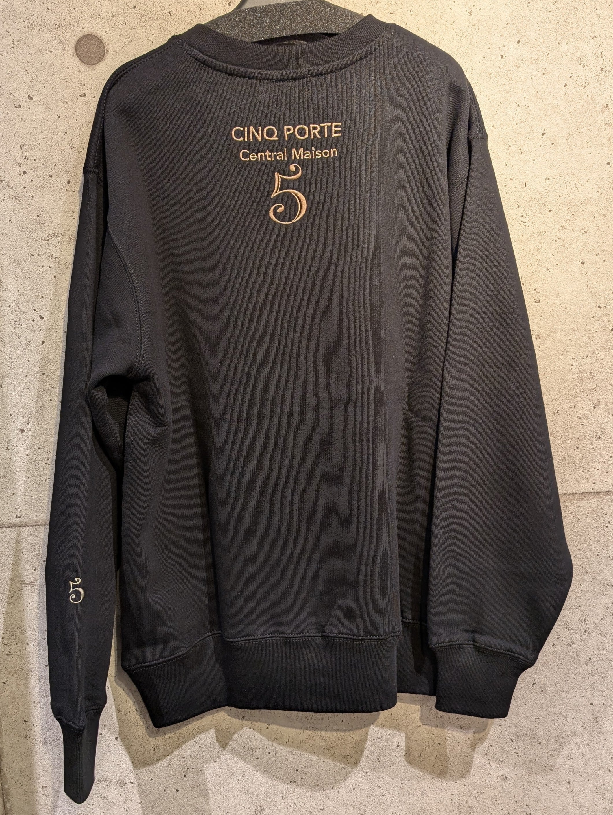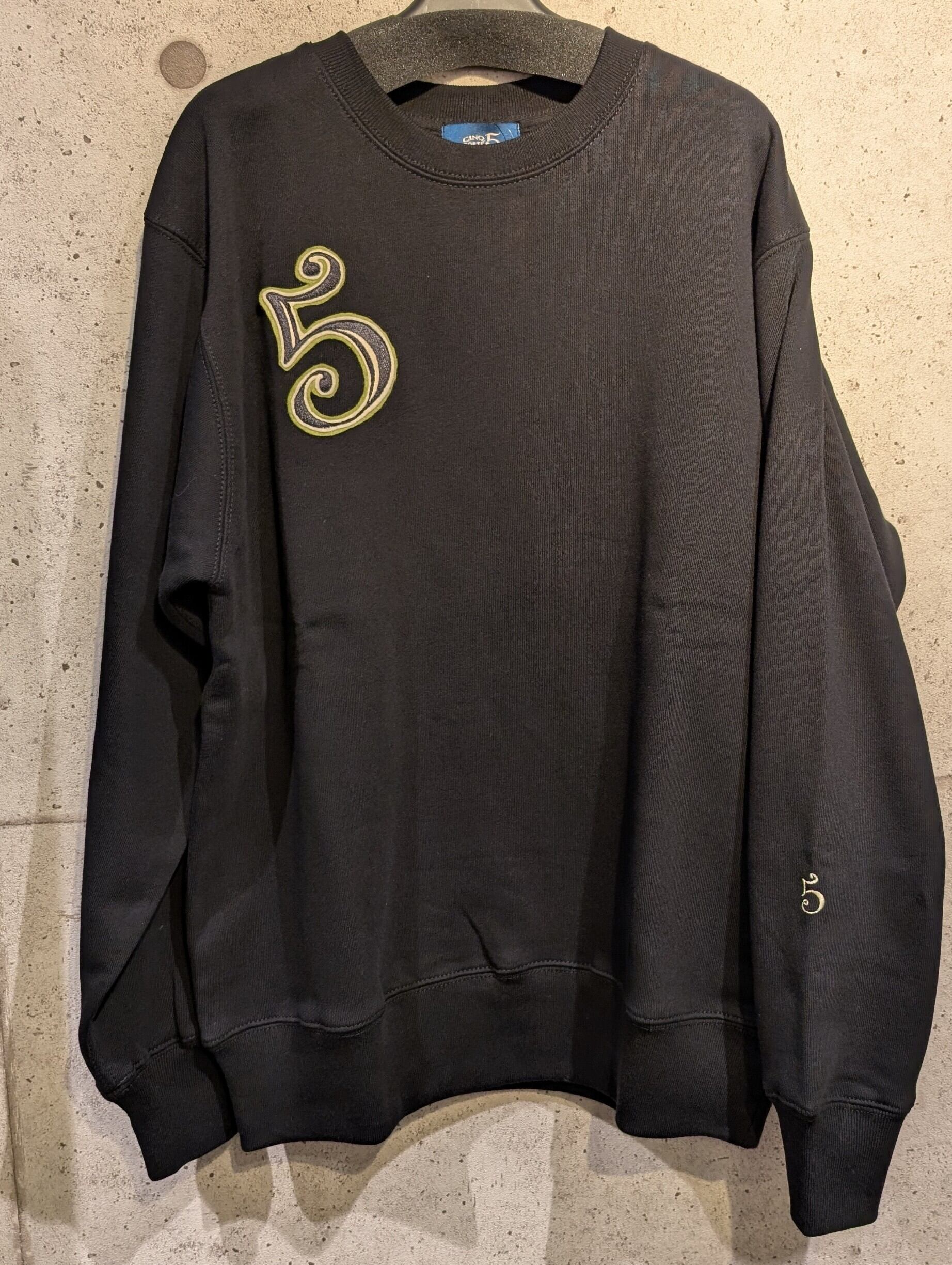 ゆったりトレーナー ブラック1点物です!デザインポイントとして、2色のフェルトを使用したワッペンタイプの5の刺繍が特徴的です。シンプルながらも存在感のある一着だと思います。度詰めの裏毛素材を採用しているため、洗濯にも強く丈夫で長持ちするトレーナーです。